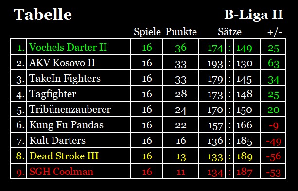 | Kult Darters | – | SGH Coolman | 11 : 9 | nachgeholt | |||